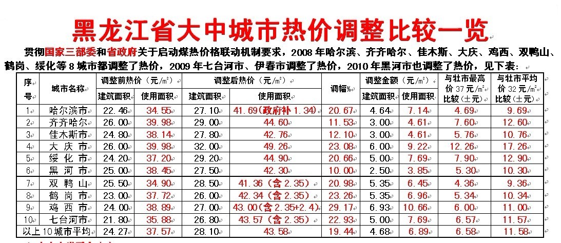 貫徹國家三部委和省政府關(guān)于啟動(dòng)煤熱價(jià)格聯(lián)動(dòng)機(jī)制要求,2008年哈爾濱、齊齊哈爾、佳木斯、大慶、雞西、雙鴨山、鶴崗、綏化等8城市都調(diào)整了熱價(jià),2009年七臺河市、伊春市調(diào)整了熱價(jià),2010年黑河市也調(diào)整了熱價(jià),見下表: