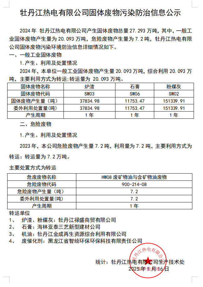 牡丹江熱電有限公司固體廢物污染防治信息公示